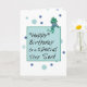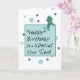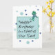 Send your Stepson birthday greetings with this delightful card. A frog is sitting atop the Happy Birthday message box waving his wishes. Blue and green polka dots fill the background setting off the frog’s jeans and striped t-shirt.