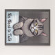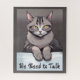 Puzzle in an illustration of a stern-looking grey tabby cat with piercing yellow eyes resting its front paws on a ledge, gazing directly forward with an air of serious authority. Below the cat, bold script reads, “We Need to Talk,” adding humour and drama.