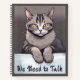 Journal in an illustration of a stern-looking grey tabby cat with piercing yellow eyes resting its front paws on a ledge, gazing directly forward with an air of serious authority. Below the cat, bold script reads, “We Need to Talk,” adding humour and drama.