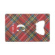 A trendy Royal Stewart Tartan plaid print covers the front and back of this bottle opener with white initial and name. Change or remove text to make it yours using the Template provided. Dimensions: 2"w x 3.25"l x .125"h. Fits into a wallet credit card slot. All over printing with protective coating. Stainless steel construction for extra durability. See "About This Product" at side for additional information.
