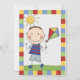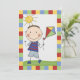Colour blocks of red, green, blue, and yellow border a cute stick figure boy with a kite and the back has areas you can easily add all your party specifics on our Stick Figure Boy with Kite customised birthday invitation!