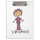 A cute nurse design features a stick figure nurse in a purple uniform and and text that reads I (heart) Nursing for I Love Nursing!