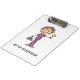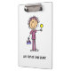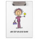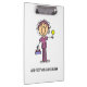 A great clipboard for nurses, features an brown haired female nurse in a purple uniform who apparently just drew blood and is offering a lollipop!