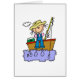 A stick figure girl in a straw hat fishing from a boat on the lake on cute customisable stick figure fishing design T-shirts, cards, mugs, tote bags, stickers, and more!