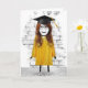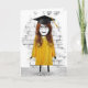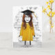 Cute stick girl with long hair, graduation diploma, sneakers, black cap, and gold gown for graduate congratulations.
