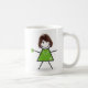 Cute stick figure girl with a green coffee mug, hair, and pearl necklace on a white background.