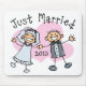 Cute happy stick figure couple with pink hearts in the background. The bride is wearing a wedding dress and the groom is wearing a tuxedo with bow tie. Text says JUST MARRIED. Customise it with your wedding date or whatever you like. Perfect for your honeymoon. PinkInkArt original!