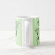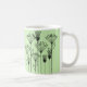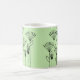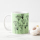 This mug has a mid-century modern design of plants made from lines, circles, triangles, rectangles, and squares in black on a green background.
