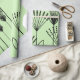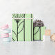 This wrapping paper has a mid-century modern design of plants made from lines, circles, triangles, rectangles, and squares in black on a green backgrounds.