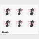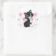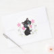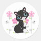 This round sticker is shown in white with a cute kitty and pink flowers print.