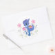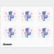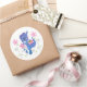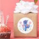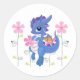 This round sticker is shown in white with a cute purple dragon and pink flowers print.
