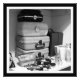 This black and white still life photo print features a collection of cosmetics brushes, lotions, cases and perfume bottles.