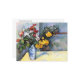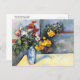 A fine art postcard with the post-impressionist painting by the French artist Paul Cézanne, (1839-1906), Still Life Flowers in a Vase (1888). A still life featuring red and yellow roses arranged in a patterned blue and white porcelain vase atop a table.