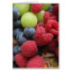 A closeup photo of the fruits in a fruit bowl, with (among others) grapes, raspberries, bromberries, blueberries.
