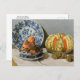 A fine art postcard with the impressionist painting, Still Life with Melon, (1872) by Claude Monet (1840-1926). A vibrant table setting of a ripe melon and peaches beside a blue and white porcelain plate.