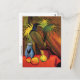A postcard with the painting, Still Life with Palms (c. 1910), by August Macke (1887-1914) a German Expressionist artist who died during WWI at 27 years old. He was one of the leading members of the Blue Rider group (Der Blaue Reiter). He was influenced by Cubism. Depicted is a potted green palm tree and apples on an orange tablecloth.