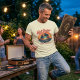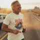 Printed on a Natural cotton base for an authentic vintage feel, the design features bold retro script, a stylised vinyl record rising over a glowing horizon, and the signature line: The Music Never Gets Old.