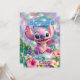 🌸 Invitation Description The image is an invitation card with a tropical, whimsical, and colourful theme, centred around the Disney character Stitch (from Lilo & Stitch). Character: A smiling, mischievous Stitch is featured prominently in the centre. Theme: The background is lush and green with large, blurred tropical leaves and bright pink hibiscus flowers visible at the bottom. The atmosphere is festive. Colour Palette: It uses bright, saturated colours, particularly vibrant blues, greens, and pinks. The background has an iridescent or holographic effect.
