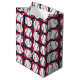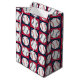 Stitched Baseballs 02-GIFT BAG-Little stitched baseballs rest on stitched background square tiles in red and blue. The baseballs alternate white with red stitching and white with blue stitching. The baseballs create an allover background pattern. This design coordinates with the baseball/wedding designs in my store galleries. The design is not specific to any occasion, making it a nice one for year round use. The stitched baseball patterns are available in assorted designs.