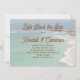 Ocean background wedding shower invitation. "Stock the bar" party type is the sample, but make it whatever you need. Blue-green seawater and modern brown text on cards with many paper upgrade options. Party title and names of the couple are in larger script. The remainder is uppercase printed font with a paragraph for all party information. Reverse is solid sea green colour.