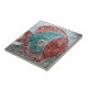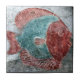 A decorative tile in a textured dark red and turqoise fish design, based on my photo.