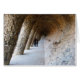 A walkway bordered by stone-covered pillars and walls in Park Guell, Barcelona, Spain.