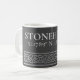 Stylish mug features latitude and longitude coordinates for Stonehenge, a UNESCO site on Salisbury Plain in Wiltshire, England. Silver Celtic border embellishment with dark grey background