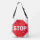 Cross body tote bag with image of Stop sign on back and Go sign on the front, in colours of red, green and white.