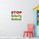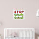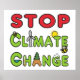 Stop Climate Change design shows the message with a big red STOP and green letters beneath. The letters contain climate change related graphics including wind and solar power, water, ice peaks, a tree, bees and temperature gauge. A fun eye-catching graphic to make the point.