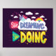 Cute colourful "Stop Dreaming Start Doing" quote with rainbows, stars and unicorn head.