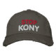A dark blue hat with bright red and white letters proclaiming the stop Kony message.