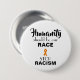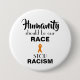 This anti racism button to help promote equality has an orange awareness ribbon (which supports the elimination of racial discrimination) and the saying: Humanity should be our race STOP RACISM.
