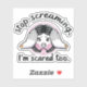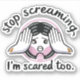 A digital illustration of a sticker with a nice, reassuringly smiling character that is calming and comfortable. It features a simple gradient effect and the phrase "Stop screaming, I'm scared too" in bold, clear typeface.