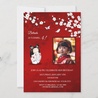 Kokeshi Doll Red White | `Photo Girl's Birthday Invitation