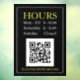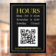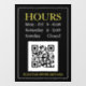 Store Hours Open Sign with QR code for store entry door or window in white and yellow text on black background with QR code message.