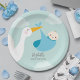 A cute white stork carries a baby in a blue bundle through the sky, perfect plates for boy baby shower. Also available in pink and yellow baby bundles. MATCHING items in our store.