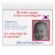 The stork is finally arriving with a beautiful baby from S. Korea for you! These sweet announcements are perfect for sending out to friends and family to announce that your adopting and show them a photo of your new baby. The front has an illustration of a stork flying with a little baby wrapped inside a Korean flag blanket. Inside there's a place for you to add your baby's picture and include the information you'd like to tell everyone.