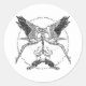 Fantastic illustration by Dugald Stewart Walker from the children's book, "Fairy Tales from Hans Christian Andersen", published in 1914. Black and white drawing of two storks in flight, their necks crossed, carrying two baby satyrs, surrounded by a ring of stars. From the story "The Flying Trunk".