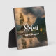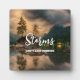 A plaque with a beautiful photograph. An evening shot with mountains and a calm lake. Cottage lights off in the distance. Text says: Storms don't last forever.