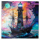 Sailboat light house in stormy seas under a full Moon and a colourful abstract skies