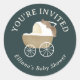 The sticker features a vintage-inspired illustration of a baby buggy with a sleepy squirrel curled up on top, set against a deep forest green background. The intricate details and nostalgic design bring a whimsical forest theme to your invitations, setting the tone for a magical baby shower event.
