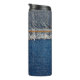 Straight stitch with orange thread on bleached denim fabric with fringe edge, on blue denim background, text place, copy space. Denim blue jeans fabric frame. Worn Jeans Casual Double Colour patch