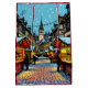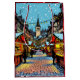 A Christmas gift bag with a cartoon depiction of the Strasbourg, France Christmas market depicting shopping booths and people walking around on a snowy winter day.