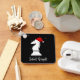 Silent Knight chess piece in softly falling snow wearing a red Santa hat for Christmas. A fun play on words of the traditional Christmas carol, Silent Night A unique gift for someone who loves the strategic board game of chess and Christmas puns. Text on back can be customized, or change it to a personalized message, or delete it completely.