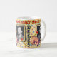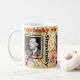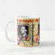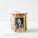 Dogs love classical music. At some animal shelters, the dogs go to sleep each night with the soothing sounds of classical music. When the music begins, they all stop barking and settle down to sweet dreams. The designs in this "Dogs love classical music." series celebrate the intuitive connection between dogs and this wonderful music. The design on this mug features a photographic portrait of the composer Igor Stravinsky. The portrait is in an art deco wood and gold frame, on a wallpaper background of thin yellow stripes, with light blue crosses and dark pink dots and triangles. In front is a photo of a dog wearing glasses, commenting (in English and French), and pointing with red arrows to the composer. The text says "Stravinsky - He had glasses.".