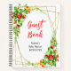 This beautiful and elegant guest book features watercolor strawberries, daisies and foliage on a gold geometric frame. The text combines handwritten script and serif fonts for a stylish and modern look. This is perfect for a spring or summer rustic baby shower.