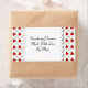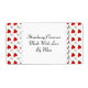 A custom canning or soap label with custom script letters and a retro pattern of red strawberries and white strawberry flowers.