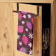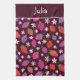 This cute custom apron featuring strawberries pattern in red, pink and purple with white flowers on dark background.