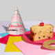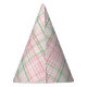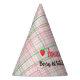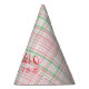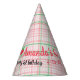 Charming party hat with pastel plaid print and customisable text. Pretty berry first party.
