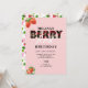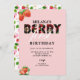 Cute girl's 1st birthday party invitation card featuring a watercolor illustration of strawberries. The text says "Join us to celebrate XX's berry first birthday party"
